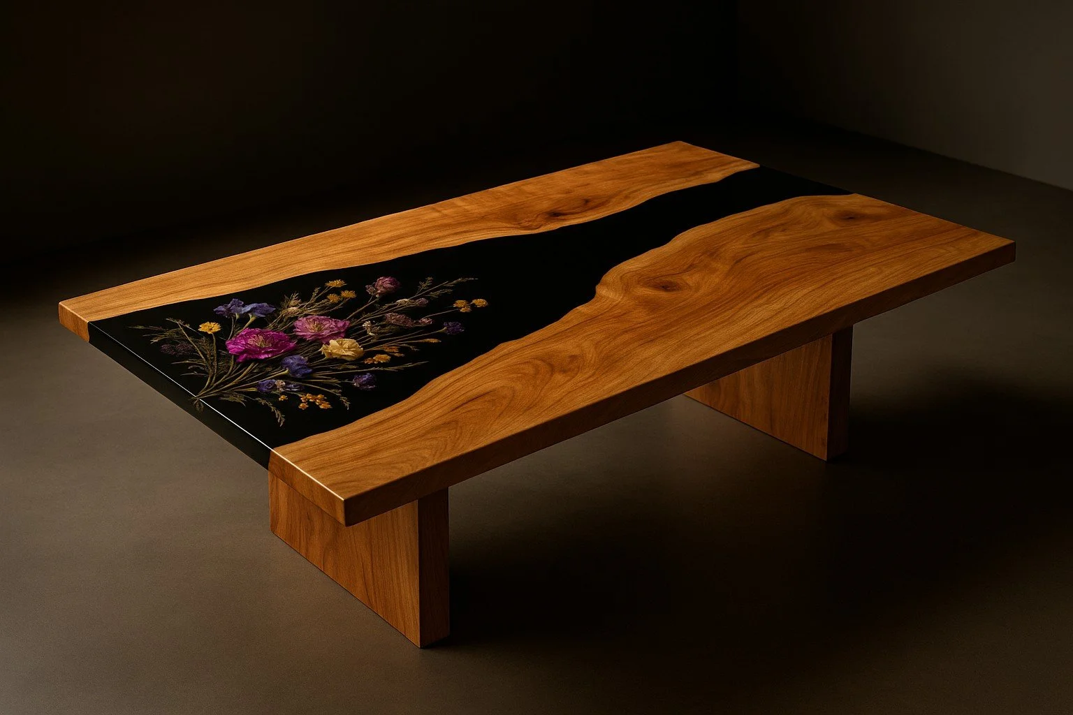 At Miloluhe Studio, we work closely with sustainably sourced hardwoods, carefully dried and prepared for stability and longevity. From dramatic river tables to floral epoxy designs, every piece is poured, sanded, and polished by hand with patience and precision.